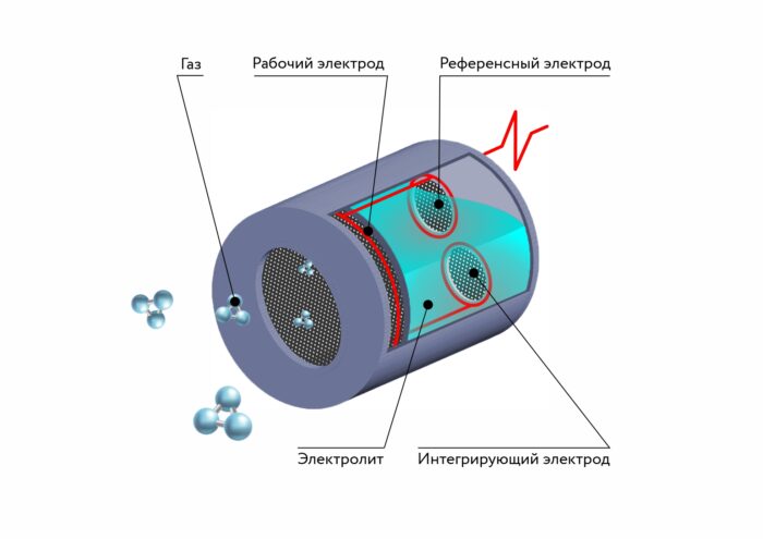 Газ, подвергаясь окислительно-восстановительной реакции, вступает в реакцию с одним из электродов. Электрохимический процесс вызывает изменение электрического потенциала между электродами. Изменение потенциала затем измеряется и интерпретируется как концентрация определённого газа.