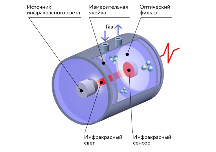 ИК-сенсоры градуируют для определения одного конкретного компонента. Присутствие других газов не будет обнаружено, если их полоса поглощения в ИК-области лежит за пределами спектрального диапазона сенсора. Кроме горючих газов (углеводородов) ИК-сенсоры могут применяться для определения углекислого газа СО2 или паров воды Н2О (при соответствующем подборе пары излучатель-фотоприёмник).